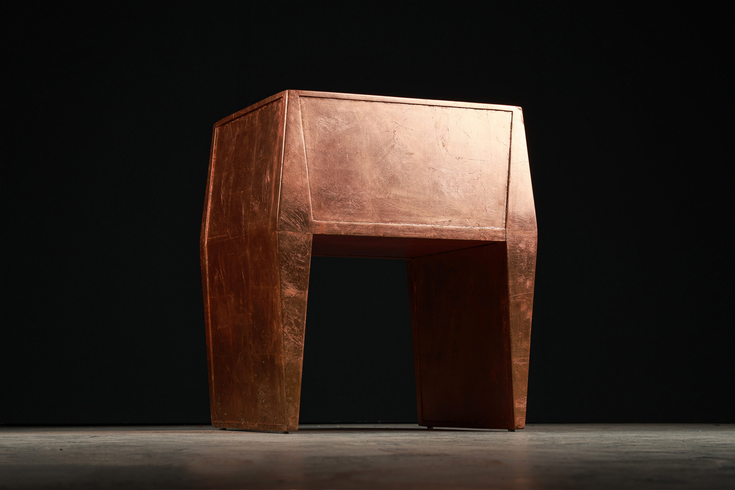 The Sapience Chair Copper Leaf Edition by SENTIENT reimagines the classic design with a striking twist, offered as a pair of captivating variations. Designed under the creative vision of Nersi Nasseri and crafted in SENTIENT’s Brooklyn workshop, this edition includes one chair with solid copper-leafed panels and another featuring the same form but with open spaces replacing the panels. The two chairs together create a dynamic interplay of presence and absence, light and shadow, blending sculptural boldness with refined elegance. The luminous hand-applied copper leaf on both chairs highlights SENTIENT’s commitment to craftsmanship and artistry, turning these chairs into functional works of art that complement each other in perfect harmony.