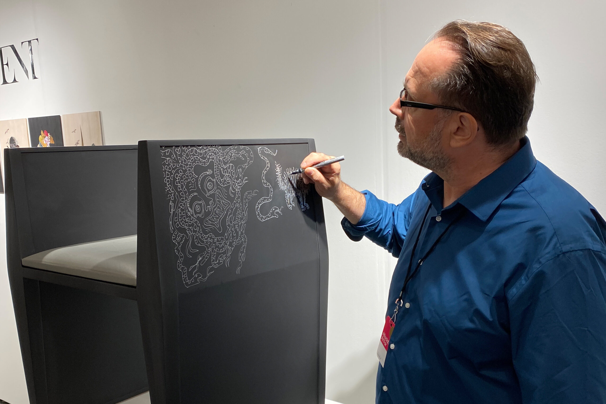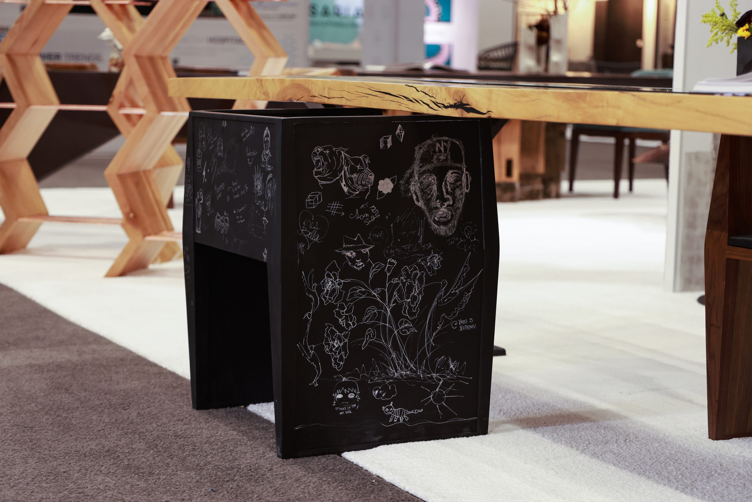 Central to this experience was the Sapience Chair, reimagined as a blank slate for audience contributions. Crafted in the Brooklyn workshop under the vision of SENTIENT’s cofounder and creative director Nersi Nasseri, the chair provided the perfect balance of structure and fluidity to inspire creativity. Fully customizable in size, material, and finish, the Sapience Chair embodies SENTIENT’s dedication to craftsmanship and versatility. At the fair, it became more than furniture—it was a platform for collaborative artistry, a testament to the possibilities of merging functional design with personal expression.