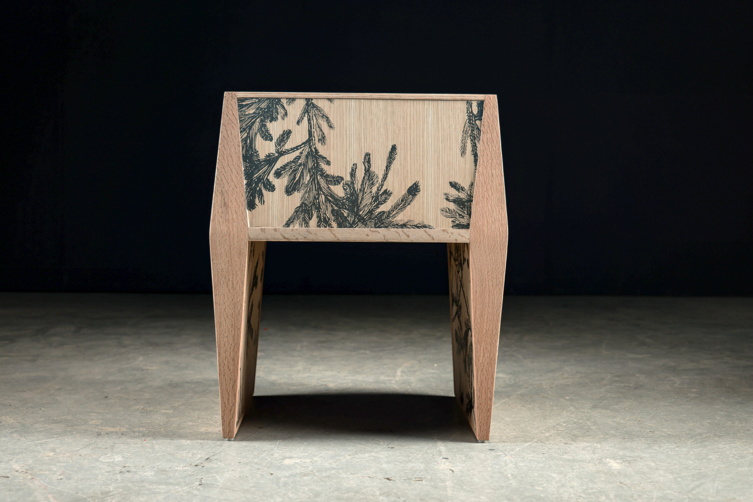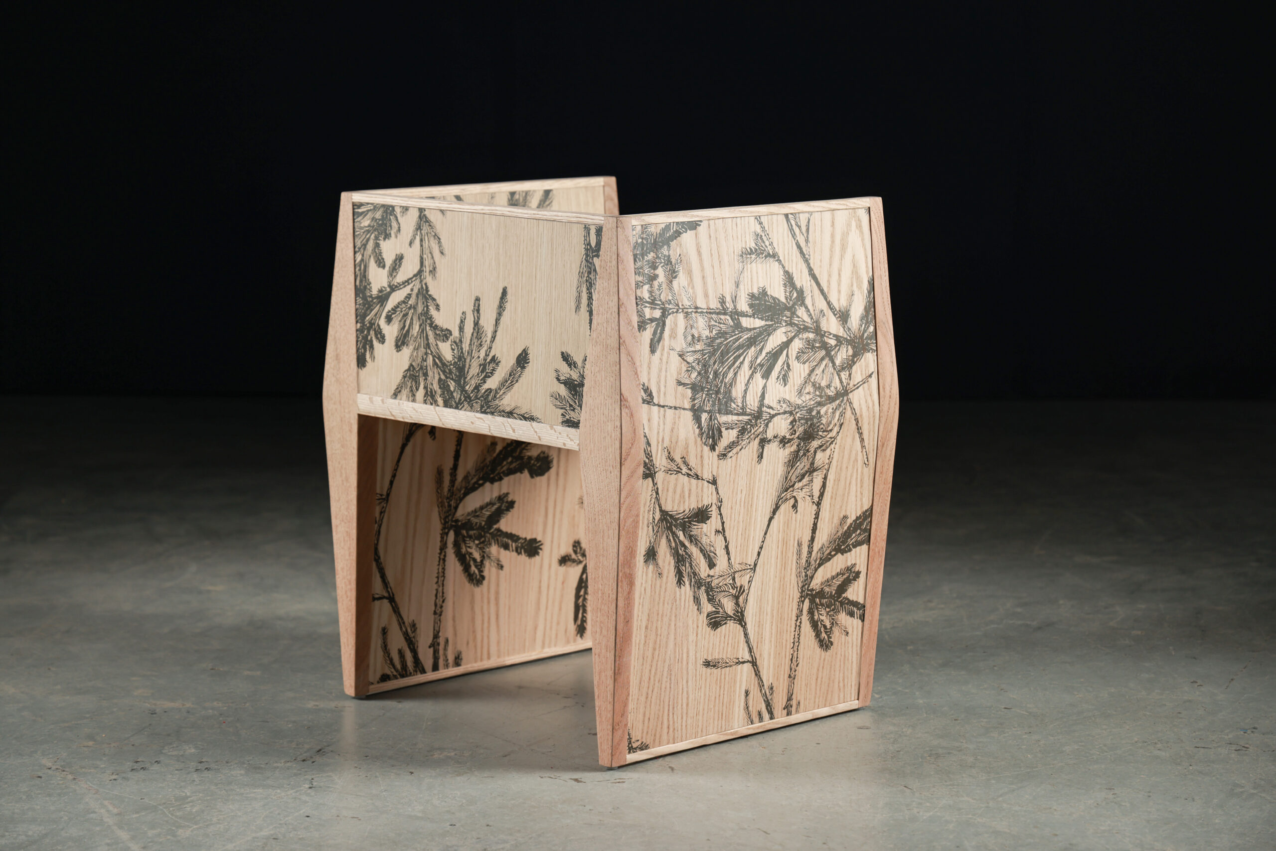 “The images depicted on the Sapience Chair and the accompanying silk screens displayed here are an extension of Riccardo Vecchio’s broader public arts project, 31 Degrees. 31 Degrees gives visibility to environmental injustice by bringing attention to disparities in tree coverage, with drawings that will be translated into murals to bring arboreal beauty to areas where walls are more prevalent than trees. 31 Degrees aims to work with city agencies, organizations, and communities to facilitate the planting of trees in neighborhoods that need them most.