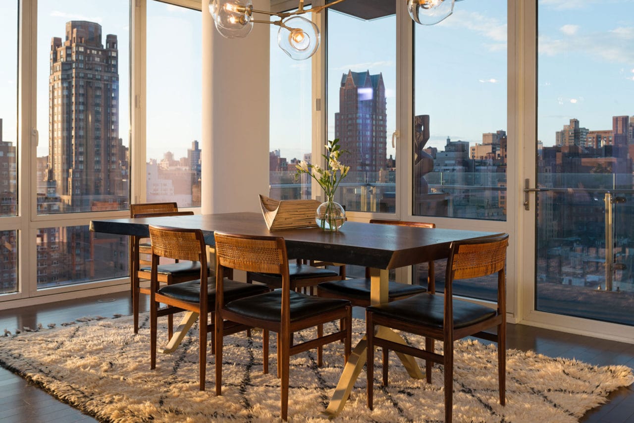 For this apartment near the Flatiron building, SENTIENT designed a custom canopy bed with interchangeable panels on the headboard, as well as a live edge dining table in American black walnut. This custom project units utility with beauty, inspired by the vision of the designer.