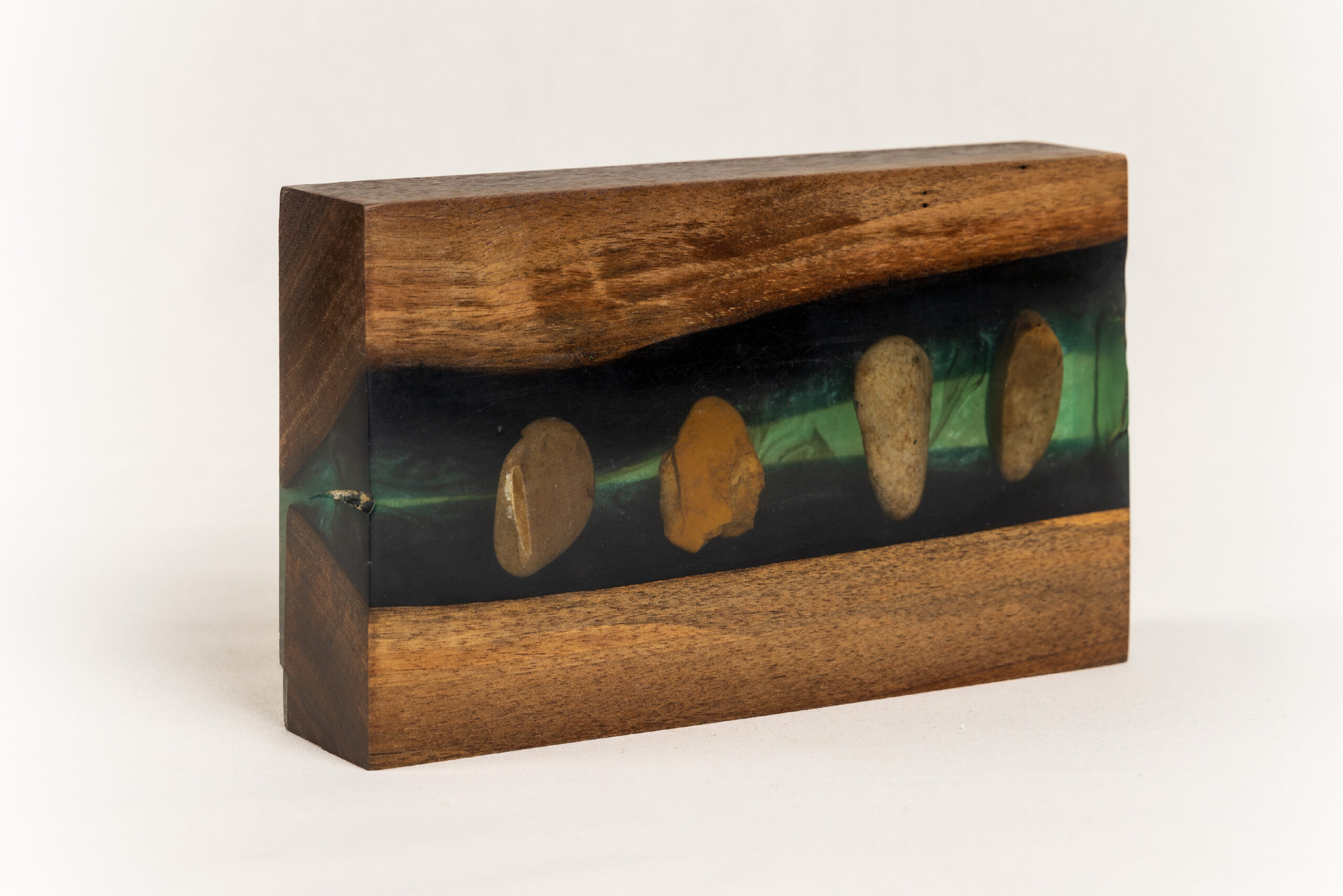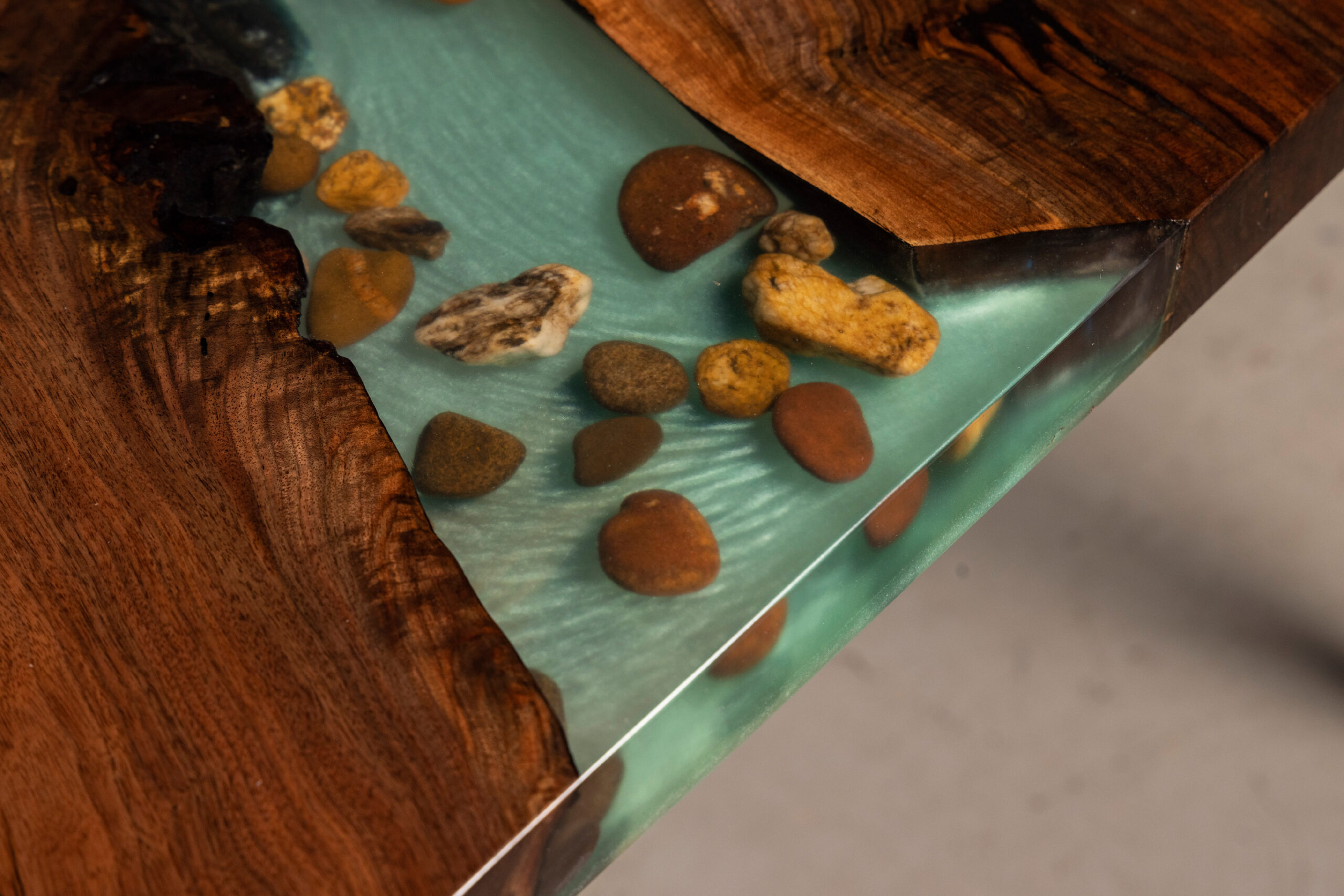 The epoxy resin, mixed with pigments in shades of turquoise and other vibrant hues, brings depth and dimension to the design. Our craftsmen carefully monitor the resin as it is poured, maintaining the perfect balance of color, clarity, and flow. By adding natural elements like pebbles, shells, and stones, each table takes on its own distinct personality—an homage to the beauty of a flowing river, frozen in time.