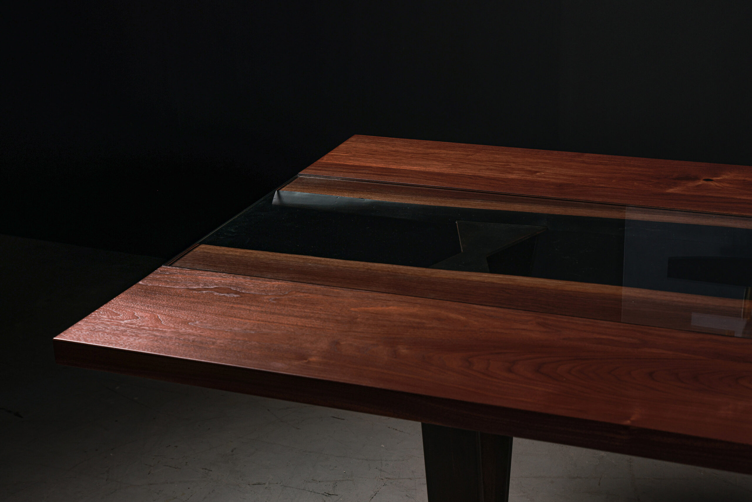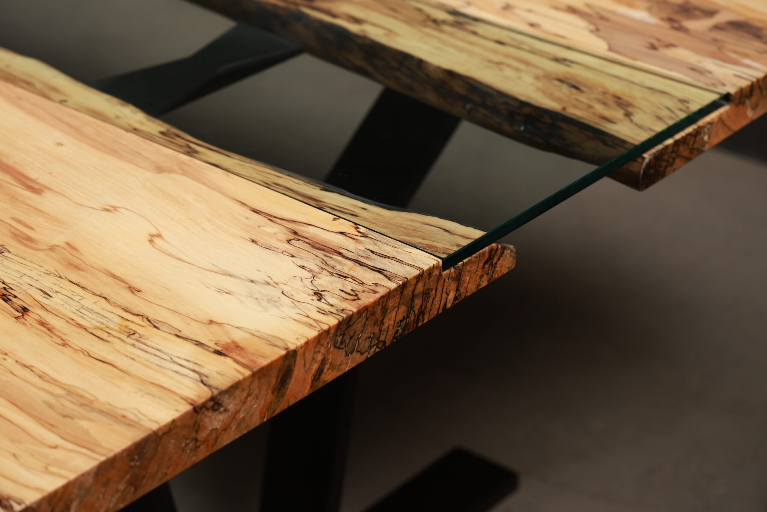 - Materials: Ambrosia Maple / Spalted Maple / American Black Walnut, Tempered Glass, Steel Legs