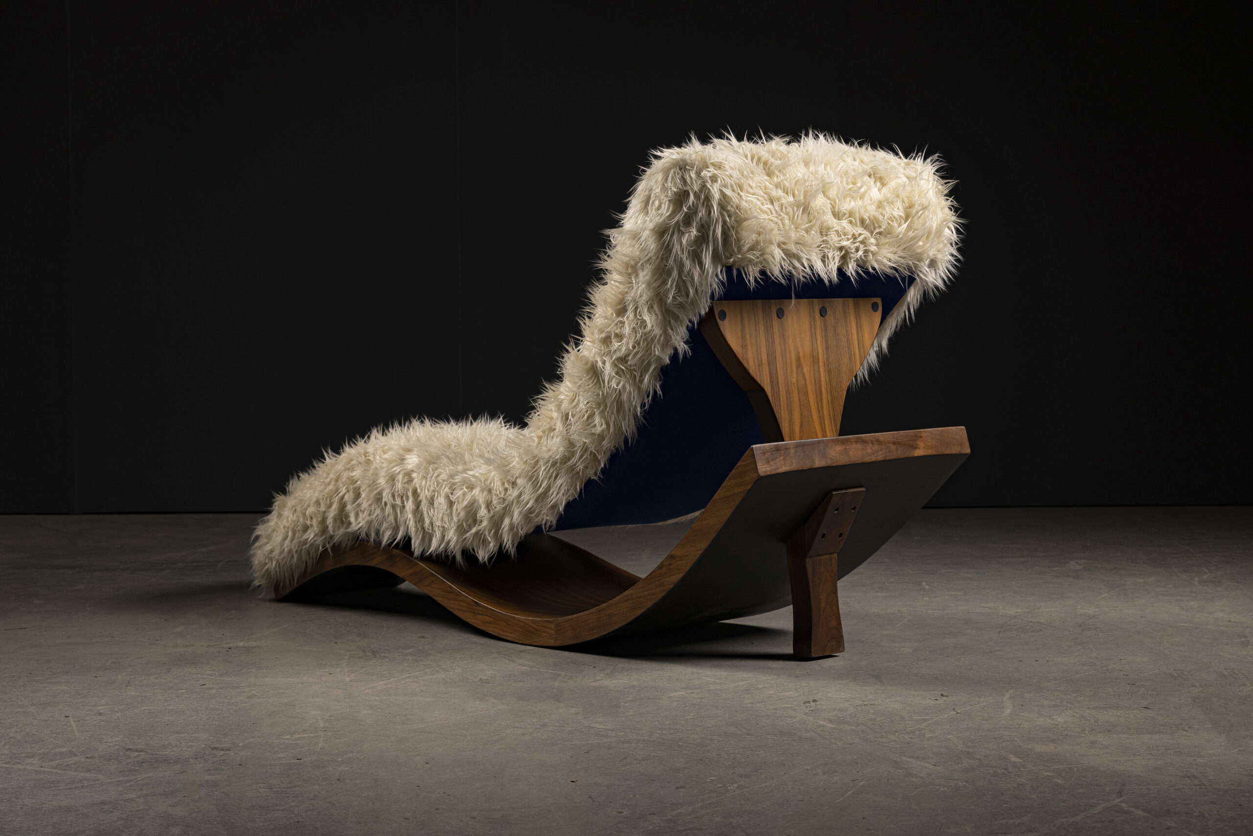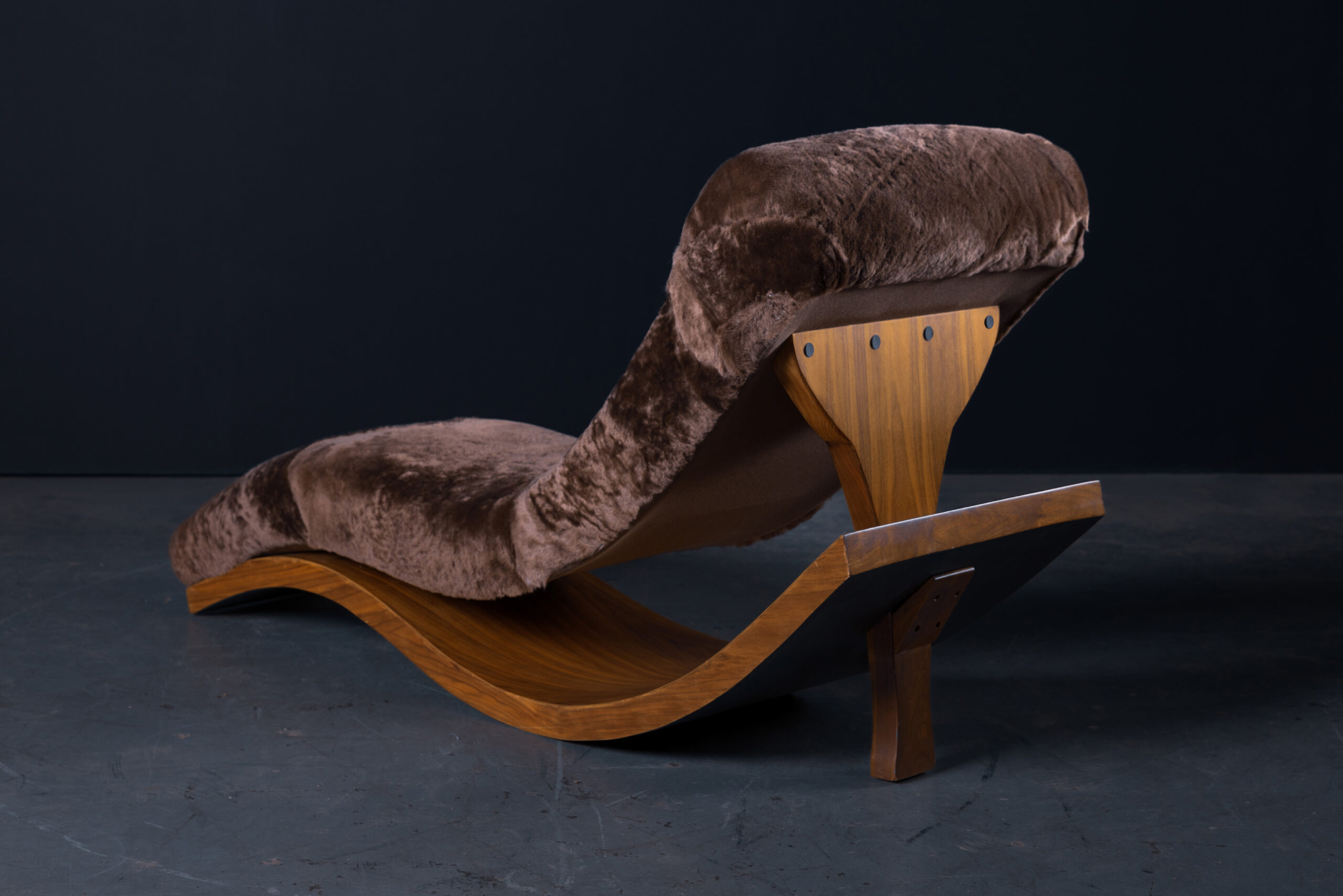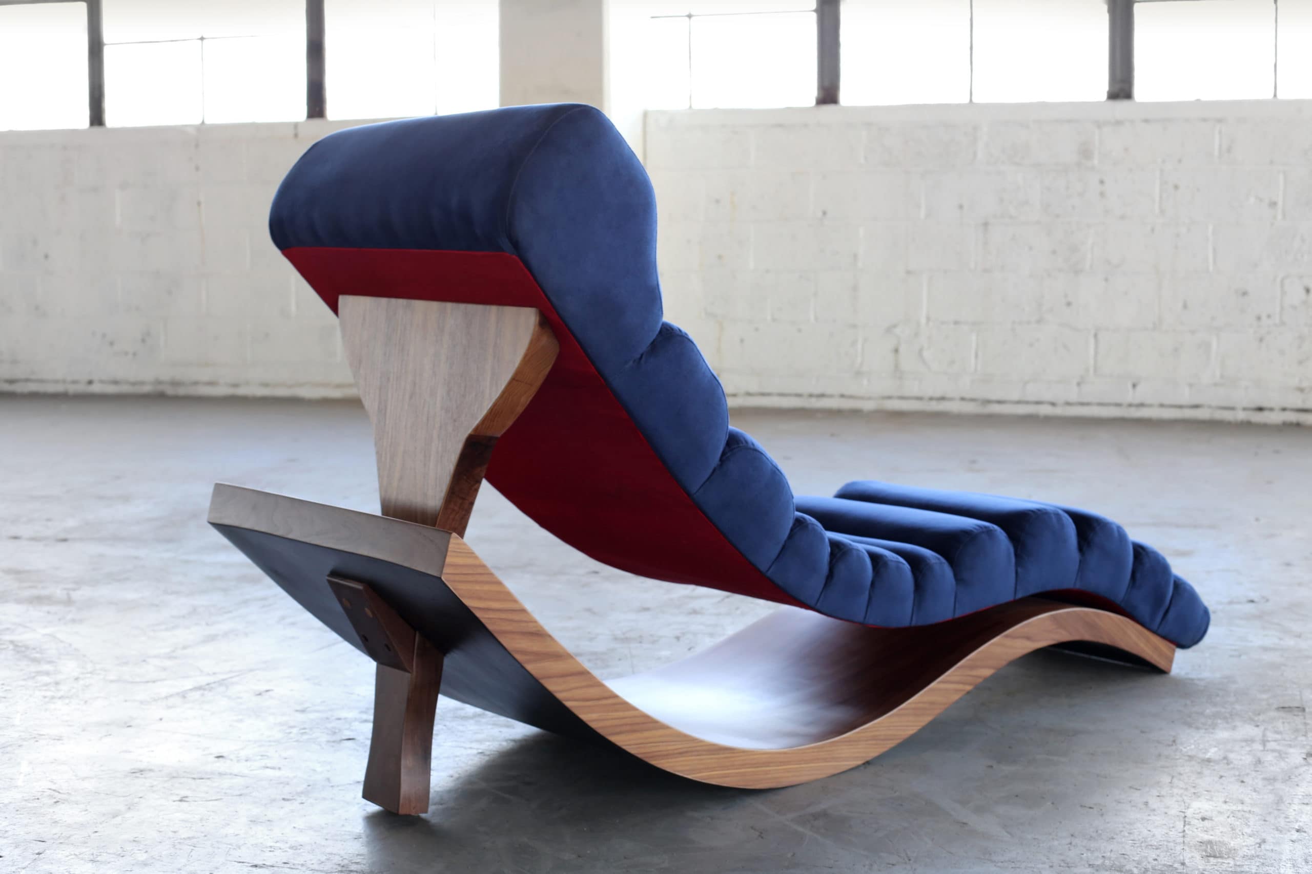 To further the dynamic movement of our luxury chaise lounge, we’ve added a base option that gives a rocking motion to its fluid form. The linear, curved wood base exemplifies its visual splendor while adding whimsy to the ergonomic seating experience. An artful bespoke design, handcrafted in our Brooklyn, New York workroom. Offering a visual and experiential delight, this armless chaise lounger invites the senses for a pleasurable and relaxing exploration.