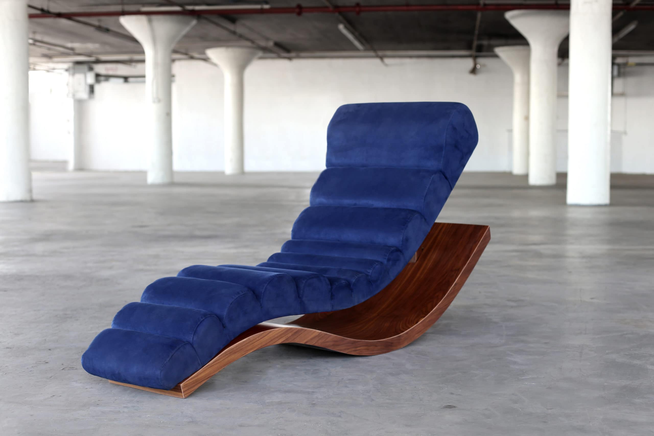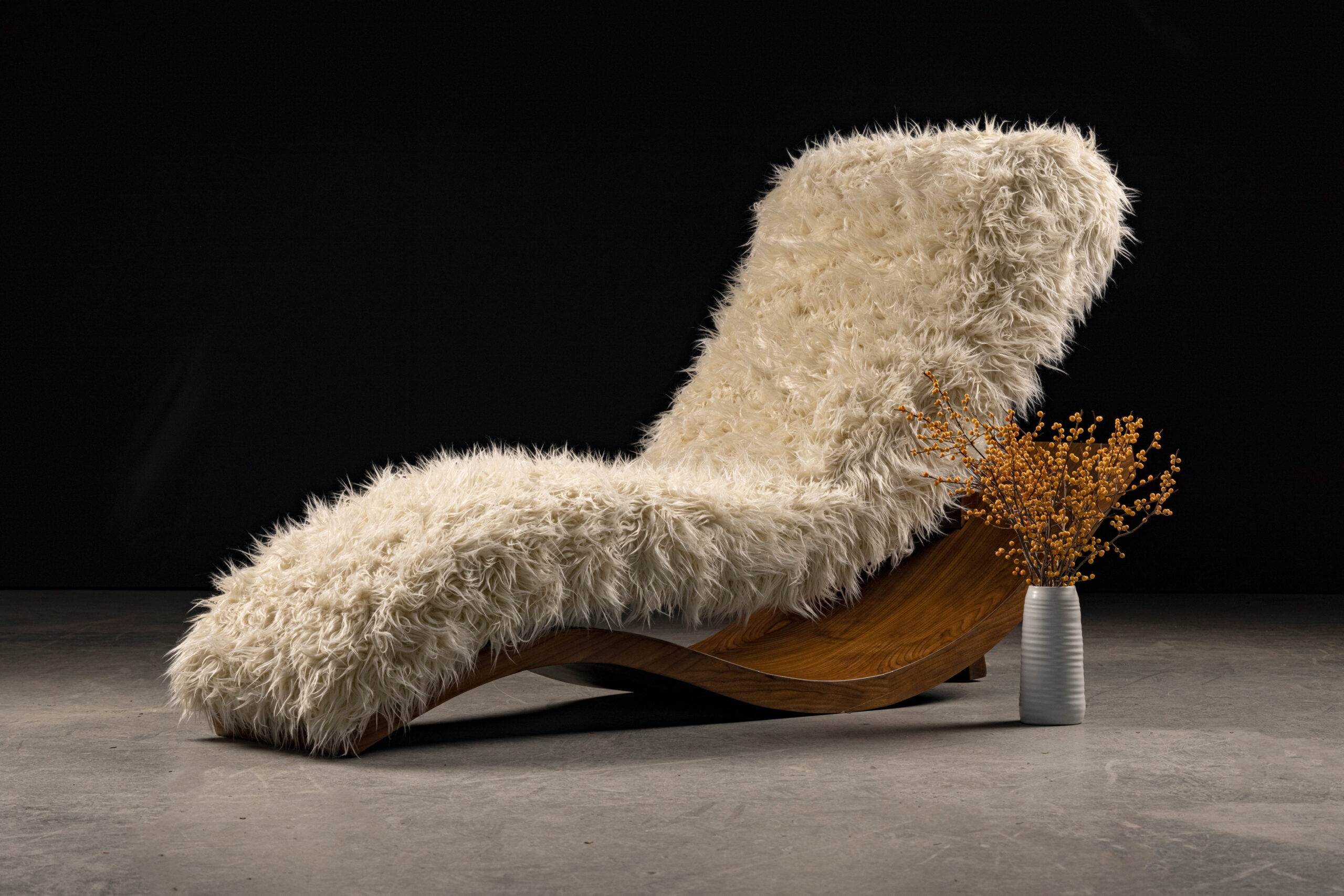 The WAVE is a luxury chaise lounge that exudes comfort and aesthetic élan. Available in a range of hardwoods, upholstery materials, and design iterations, this wavy chair can dominate the visual narrative across vastly different environments. The leather chaise lounge chair with American black walnut may be an excellent addition to an upscale office, and the white oak model with bright wool color can fit perfectly into a modern, vibrant startup environment. Dozens of other combinations are available, as we modify wood choice, finishing options, and upholstery, to create elegant and relaxing models, or bold, vibrant, and unapologetic statement pieces for the commercial space and the luxury residence.