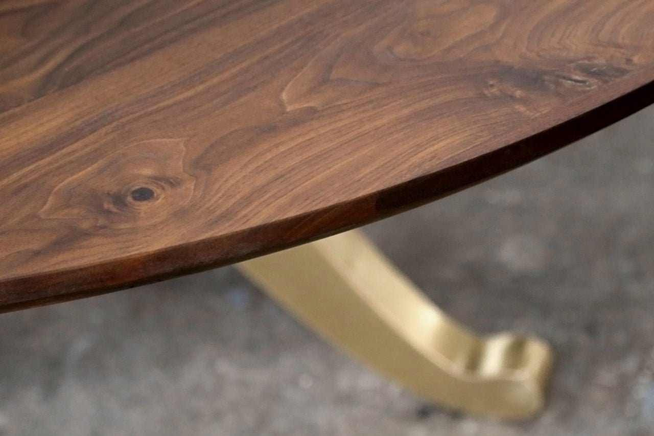 Designer Nersi Nasseri has crafted the Flow Pedestal Table in response to the growing demand for a round table that combines a pedestal base with a natural, organic aesthetic. Available with either a natural live edge or a classic round table top, the Flow Pedestal Table is shown here in American Black Walnut, complemented by an acid-washed steel and solid brass base. The live edge subtly flows from two sides of the round top, adding an organic touch that enhances the table’s elegance. Each piece is custom-made to order, allowing clients to personalize the live edge detailing to achieve their desired look.