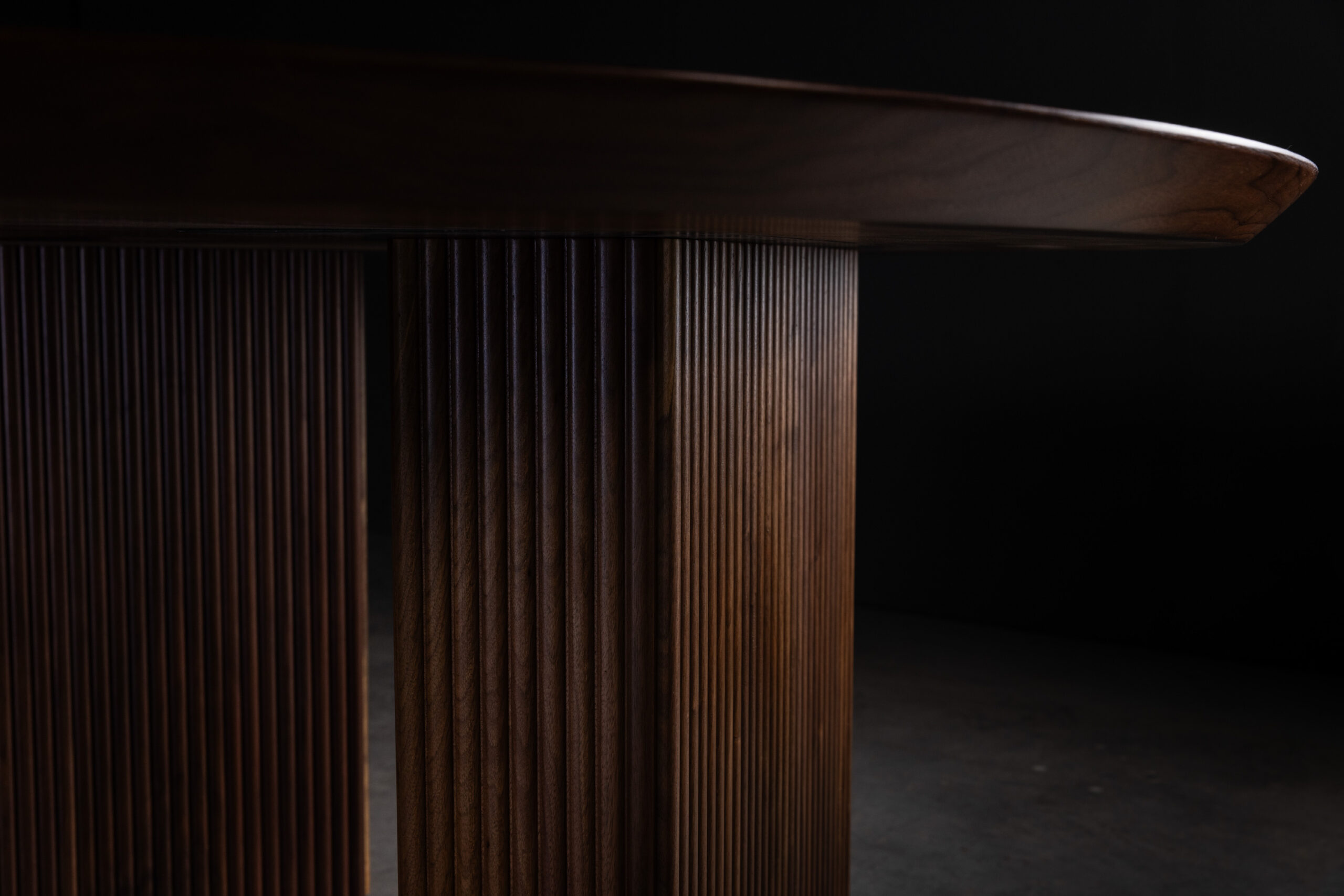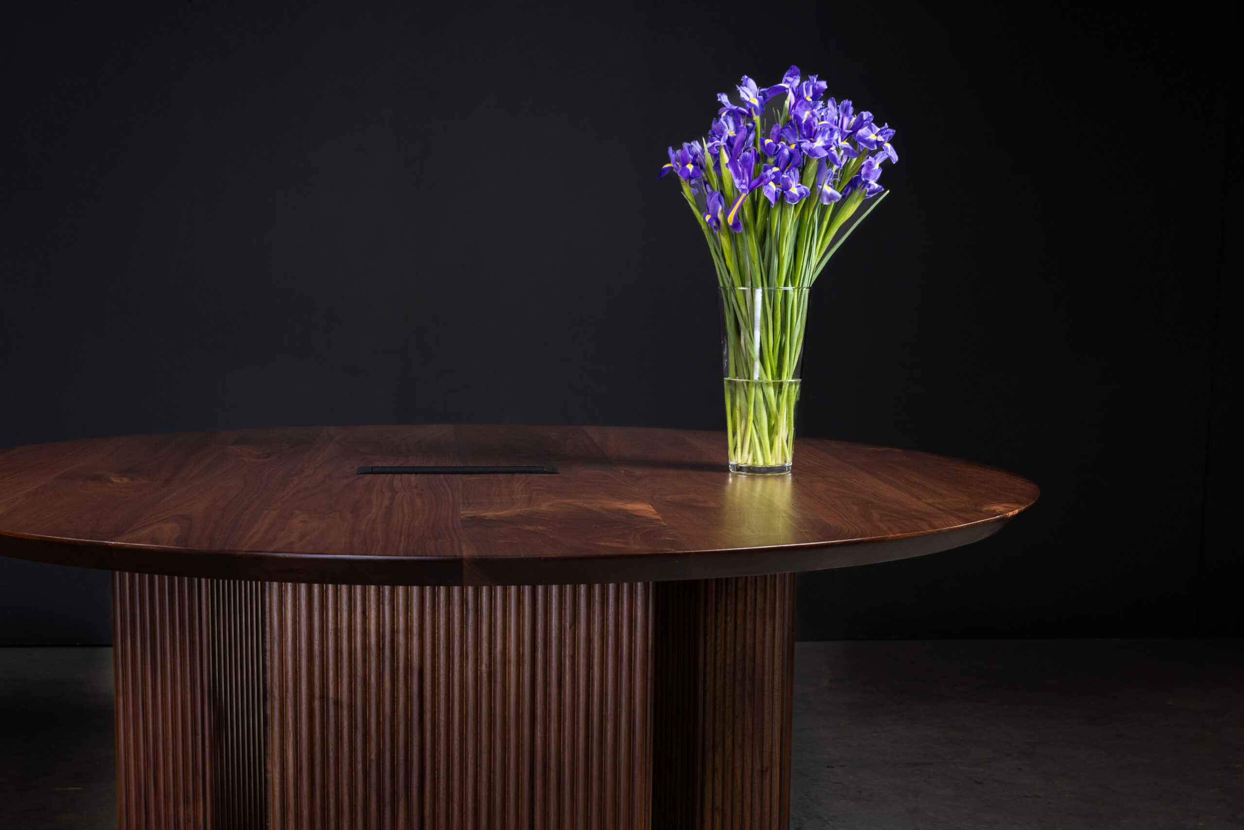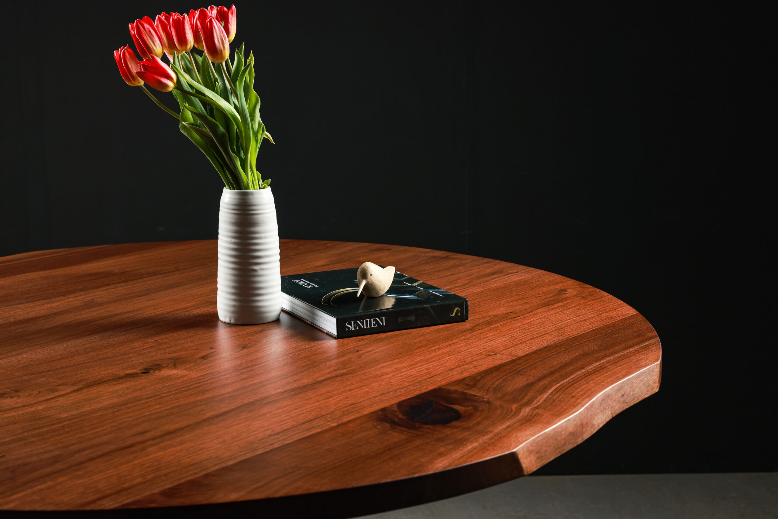 Our Flow Pedestal Table is comprised of pure materials, form, and craftsmanship. Its wood usage is not limited and can be customized to one’s own vision. Maple keeps its form light as American black walnut gives its purity depth and drama, but the woods and finished available are limited only by one’s imagination. Contrast its subtle and simplistic top with a blackened stained base and one has art for the using.